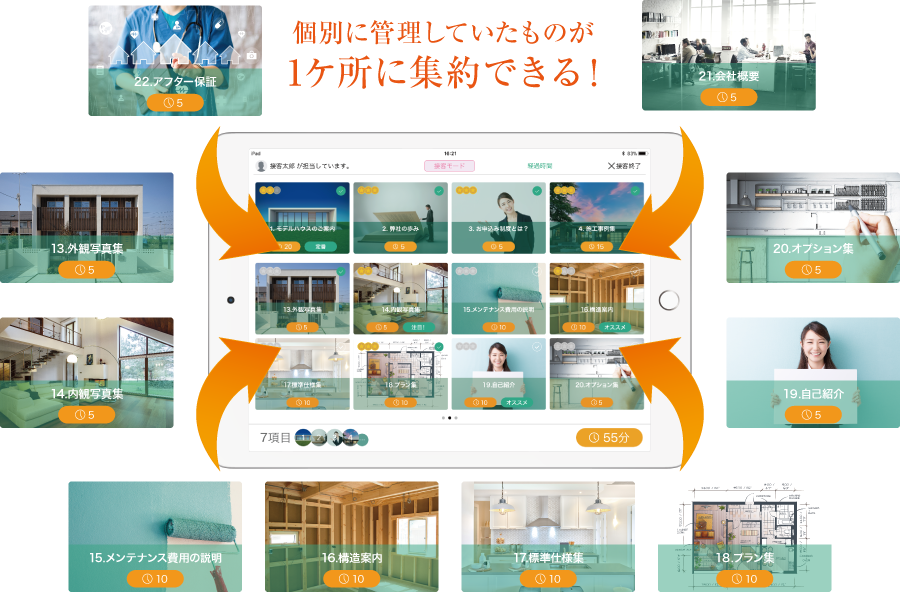接客メニューcloudは、接客用のコンテンツだけでなく「施工事例集」や「標準仕様書」や「オプション集」など各種コンテンツを登録して様々なシーンで活用いただけます。展示場案内で接客メニューcloudを利用した後、仕様書やプラン集など説明資料を別で持ってくる手間を省く事が出来るので、話しの流れに沿ってスムーズな会話が可能になります。何を登録するかはお客様次第、会社概要や自己紹介(PR)としてなど活用の幅は無限大に広がります。
